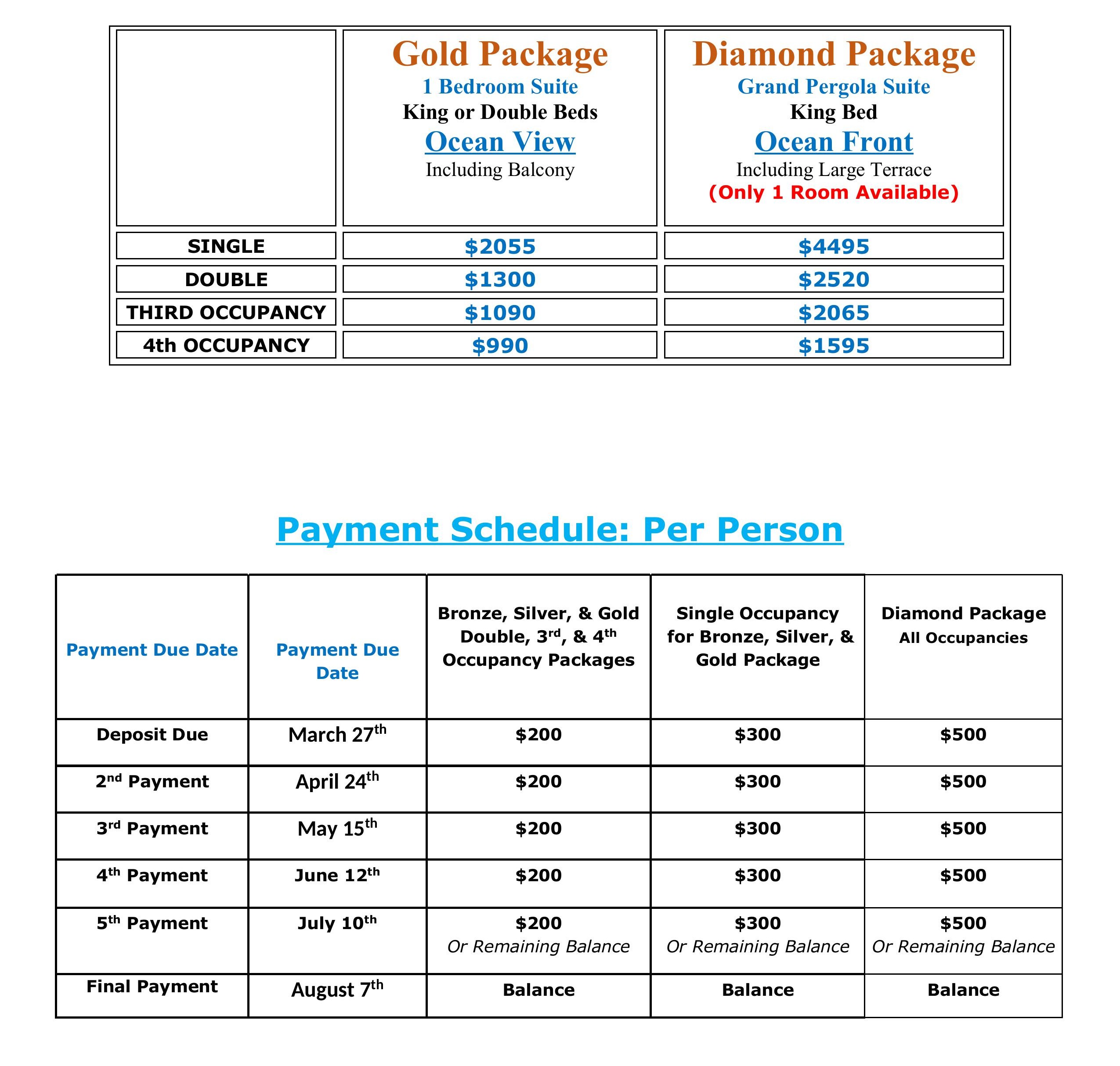 - All Guest must keep up with the Payment Schedule. If you are late making any payments you may be subject to be dropped from the trip, and refunds will be provided according to our Cancellation Policy. If a member in your room cancels or is removed for non-payment, your room’s occupancy and rate will be adjusted to reflect only the members in your room that continue to make their payments on time.